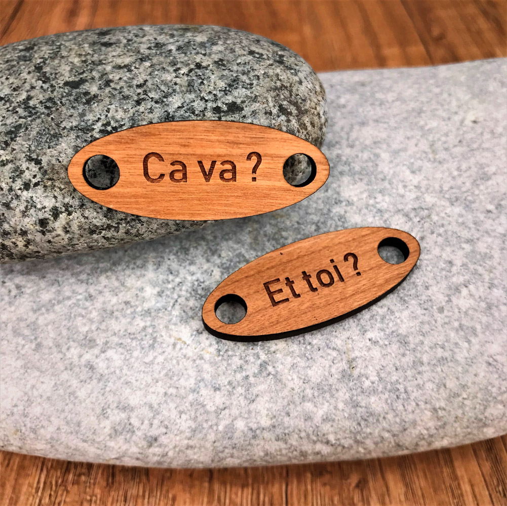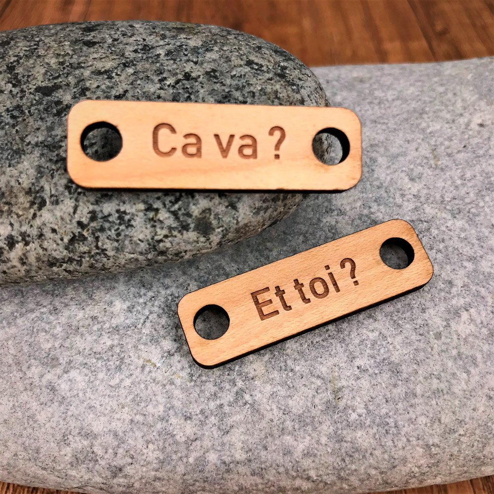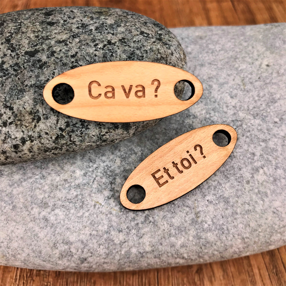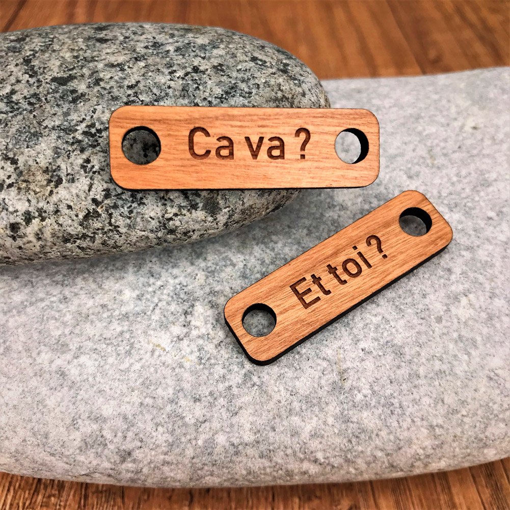 Une petite plaque personnalisée ou personnalisable en bois érable ou cerisier, selon vos envies. Il est très facile de les installer, il suffit pour cela de les fixer avec vos lacets.
