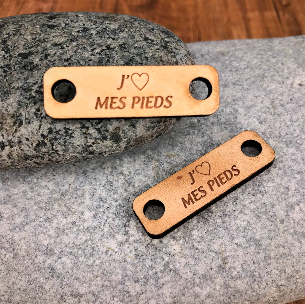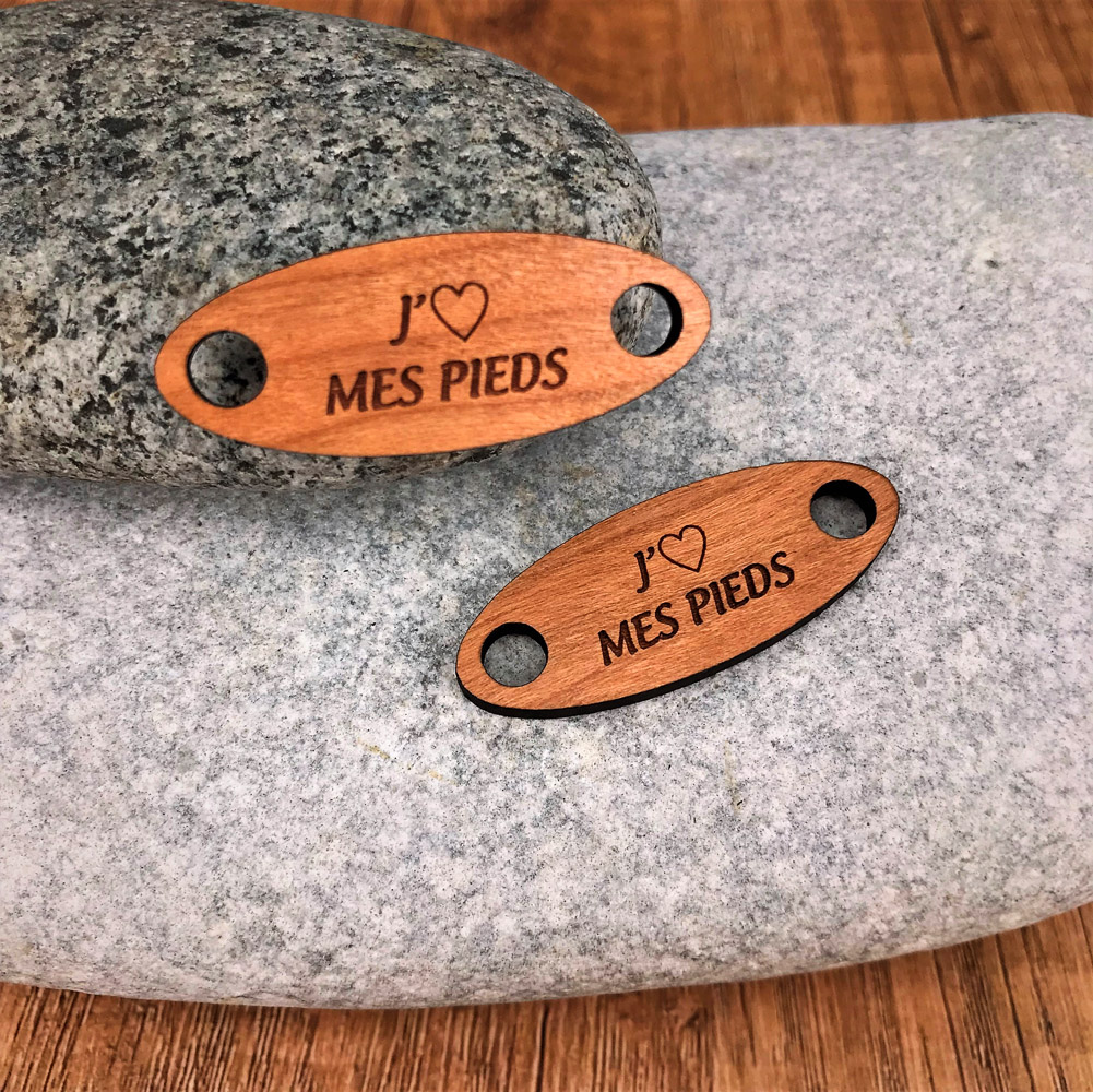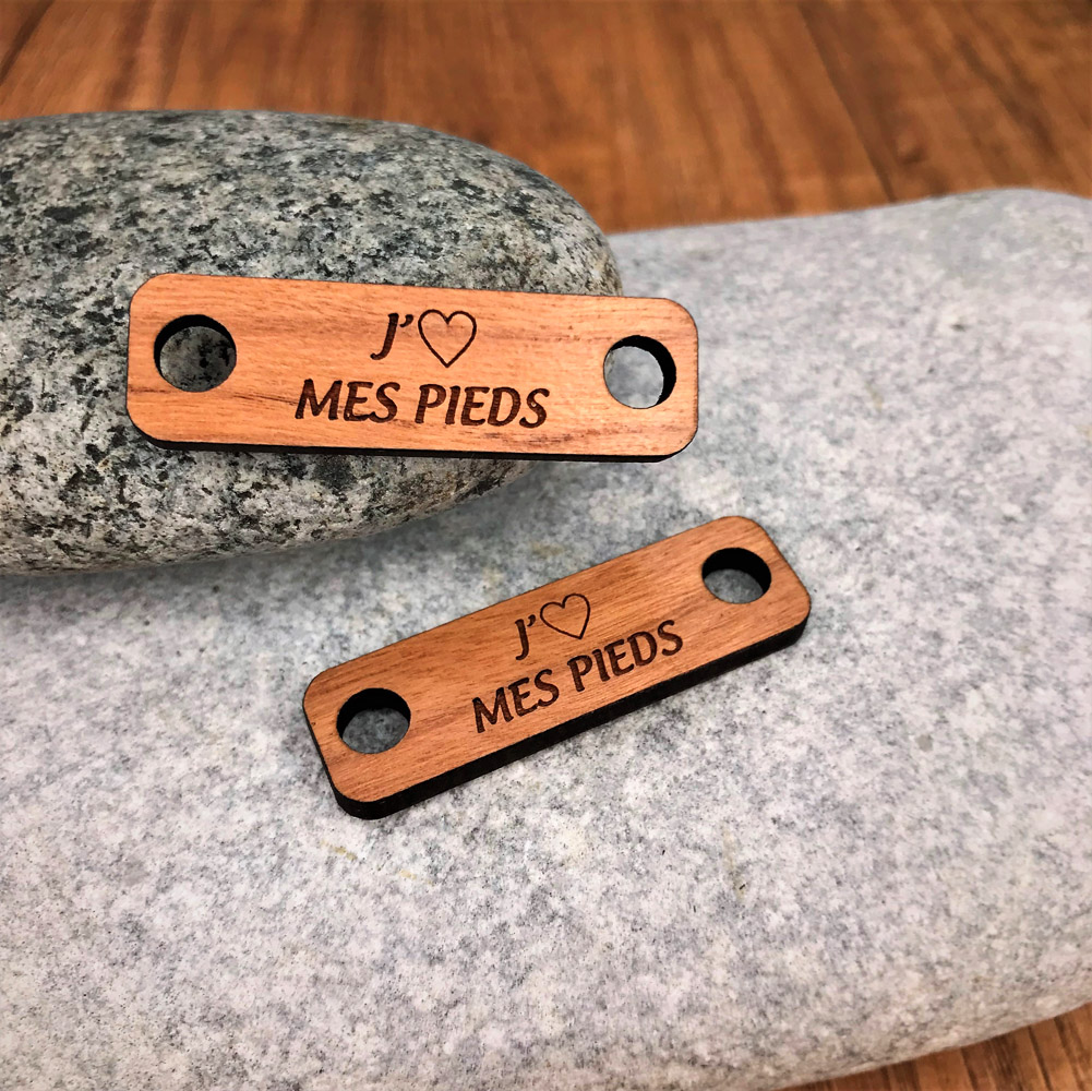 Une petite plaque personnalisée ou personnalisable en bois érable ou cerisier, selon vos envies. Il est très facile de les installer, il suffit pour cela de les fixer avec vos lacets.