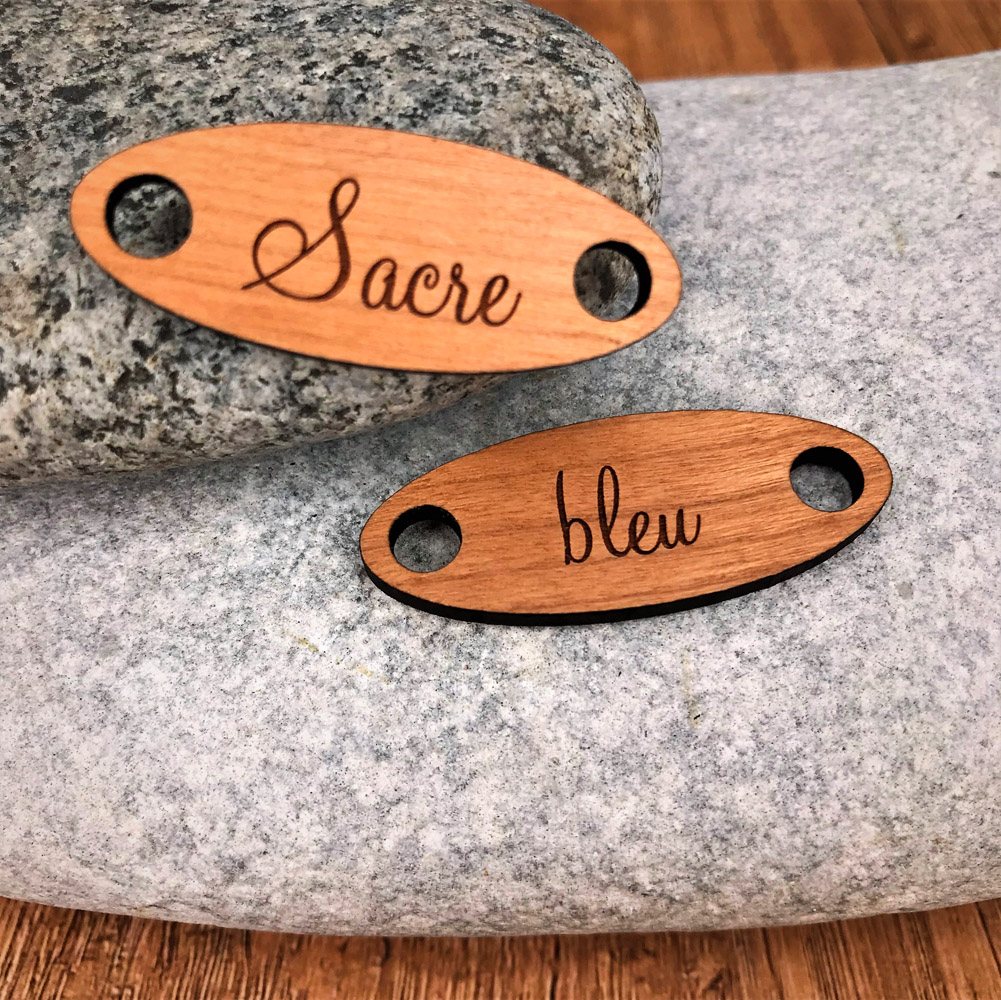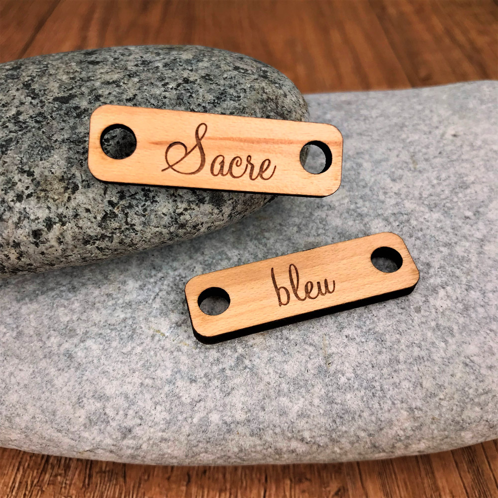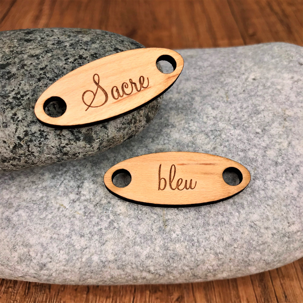 Une petite plaque personnalisée ou personnalisable en bois érable ou cerisier, selon vos envies. Il est très facile de les installer, il suffit pour cela de les fixer avec vos lacets.