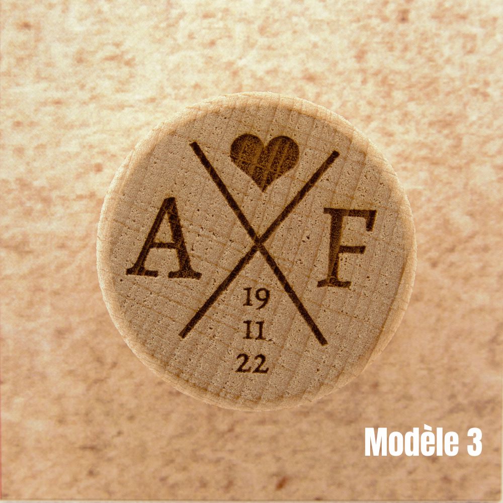 Spécial mariage ! Personnalisez nos bouchons bois et liège en remplissant les champs prénoms ou initiales ainsi que le champ date !