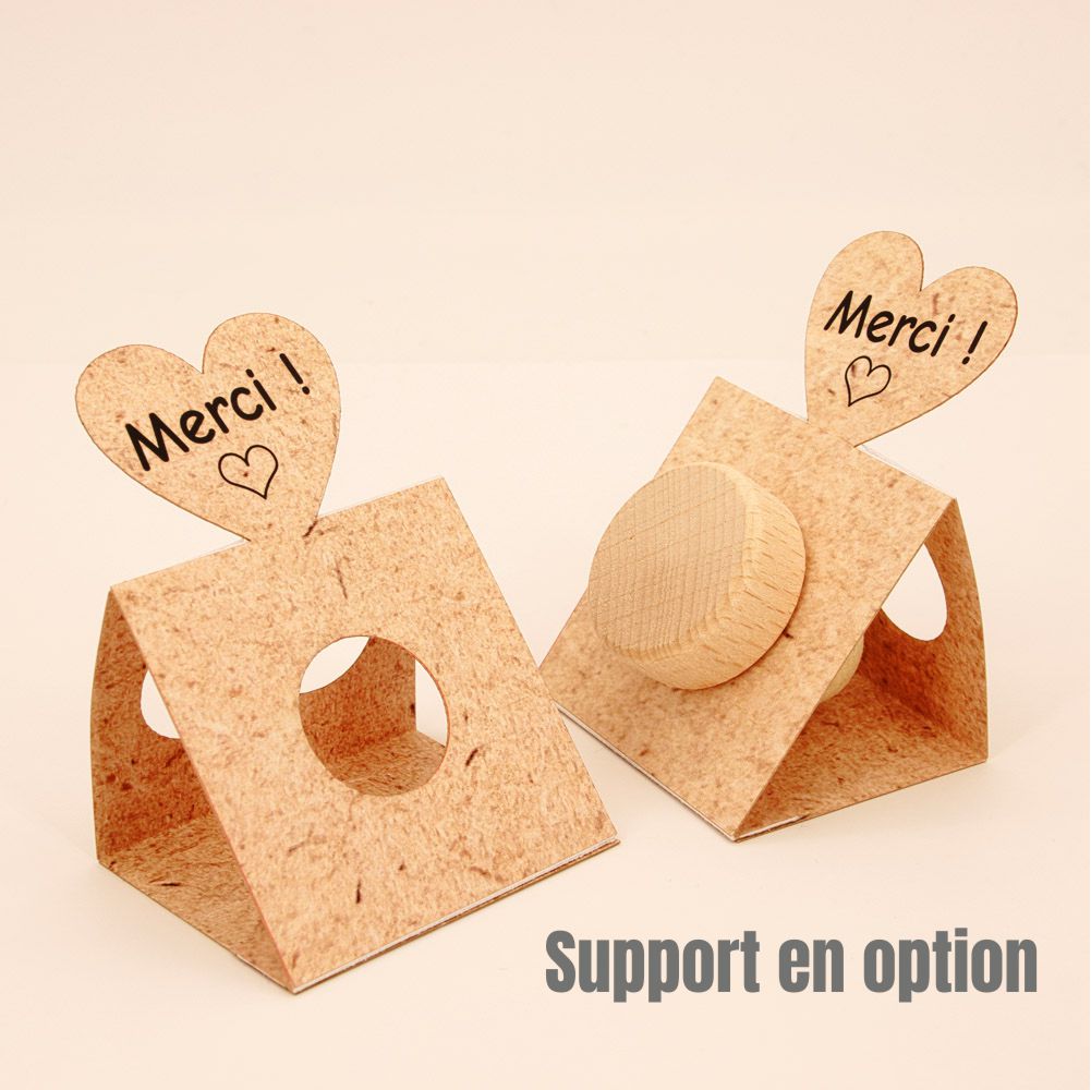 - Support « Merci ! » en carton 250 gr en option (quantité identique à la quantité de bouchons commandés). Les supports seront livrés à plat, prêts à être collés.