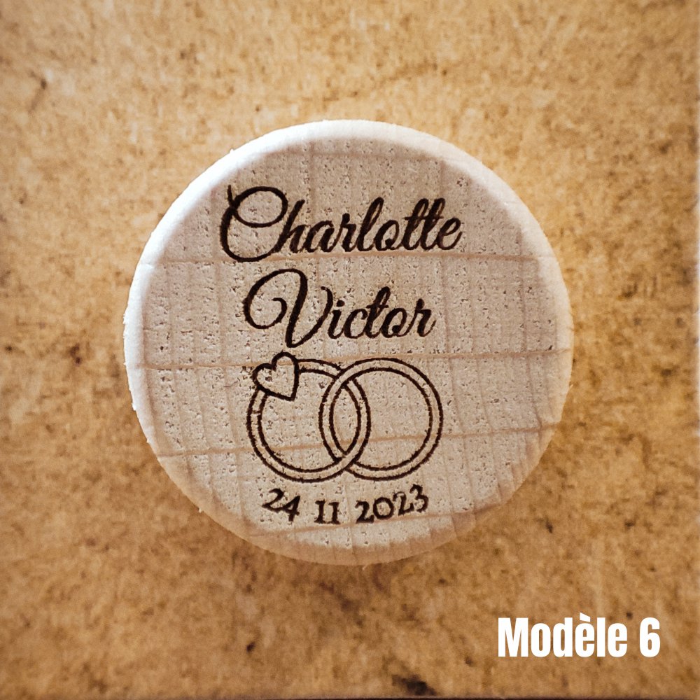 Vous n’aurez que le modèle et la quantité de bouchons qui vous conviennent à sélectionner puis les champs prénoms ou initiales (suivant le modèle choisi), le champ date à remplir, la police à choisir nous nous chargeons du reste ! Vous pourrez sélectionner l’option supports en plus si vous en souhaitez.