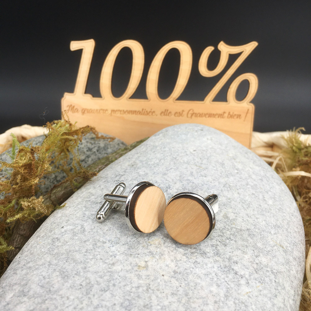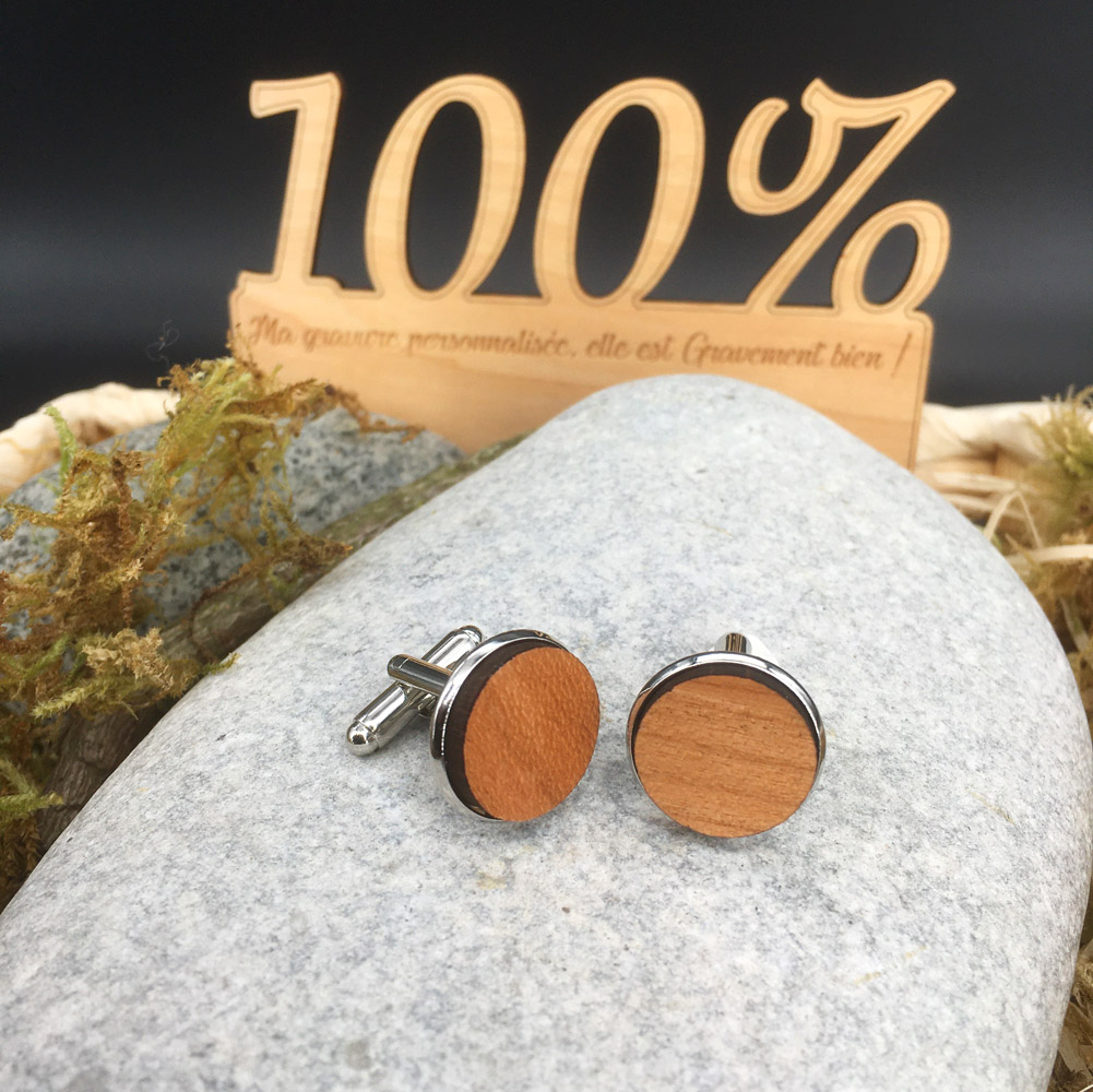 Nous réalisons nos boutons de manchettes personnalisés dans du bois de contreplaqué vernis de 3mm, érable ou cerisier. Nos boutons de manchettes personnalisés sont très résistants. La gravure laser est d’une incroyable finesse et d’une grande précision bien qu’ils ne mesurent que 16mm de diamètre. Sachez que vous pouvez également en créer un entièrement avec vos initiales ou un de nos cliparts grâce à nos boutons de manchettes 100% personnalisables. Il est à noter que nous fabriquons tous nos produits en France dans notre atelier en Normandie.