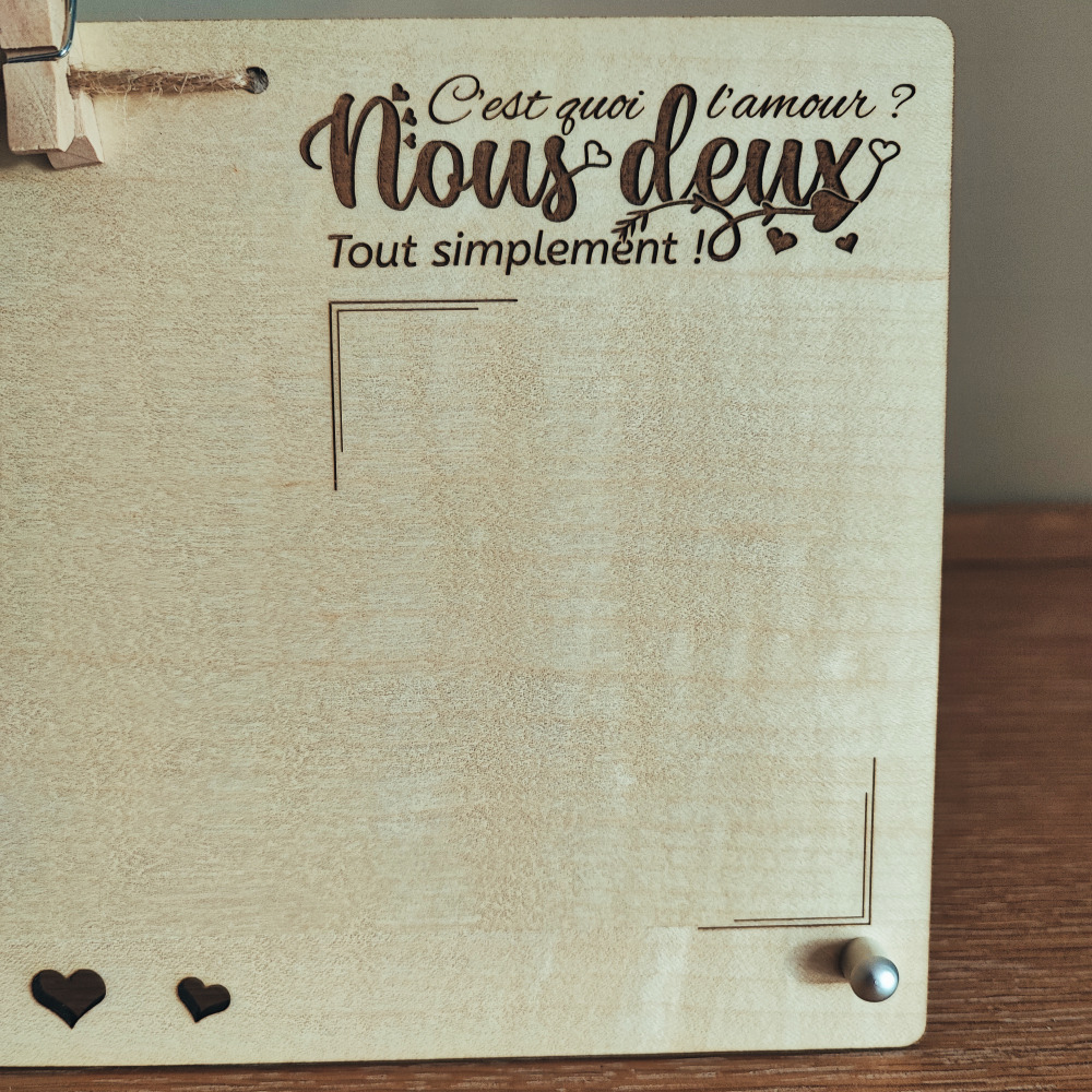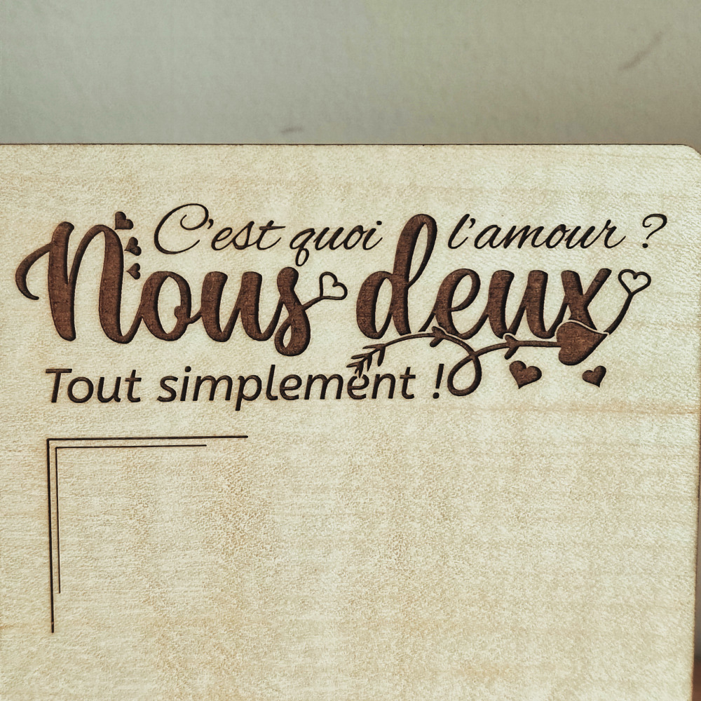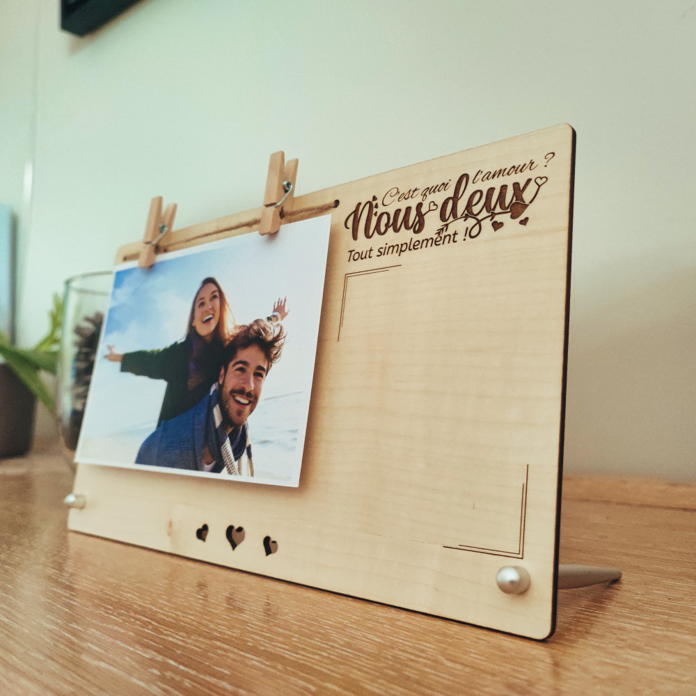 Un cadeau touchant qui marquera la personne qui le recevra. Notre cadre photo personnalisé amour trouvera parfaitement sa place sur un buffet, une console ou encore le bureau de votre amoureux(se). Le support bois est en contreplaqué d’érable vernis, un bois clair qui met la gravure en valeur et qui saura résister au temps qui passe.