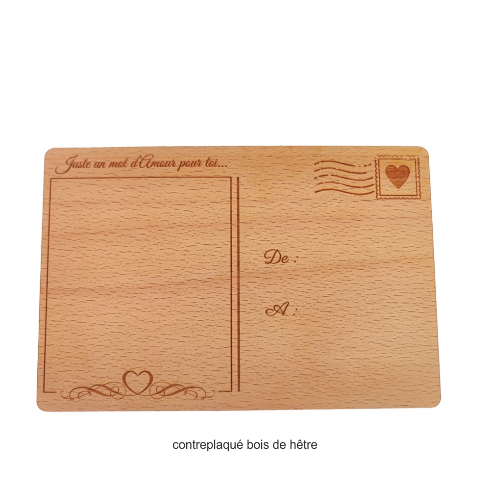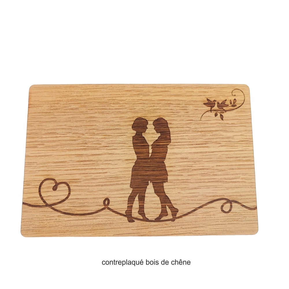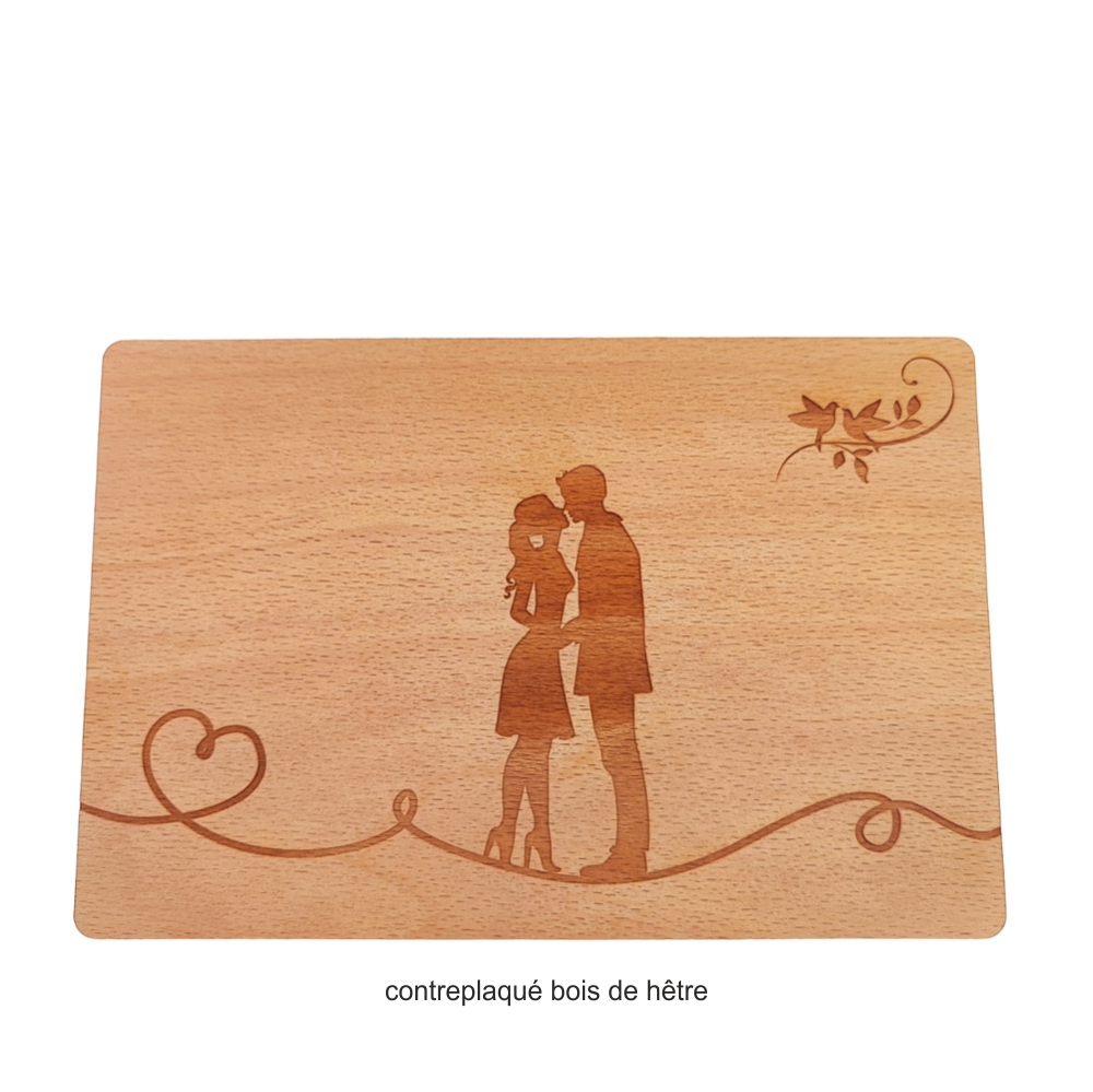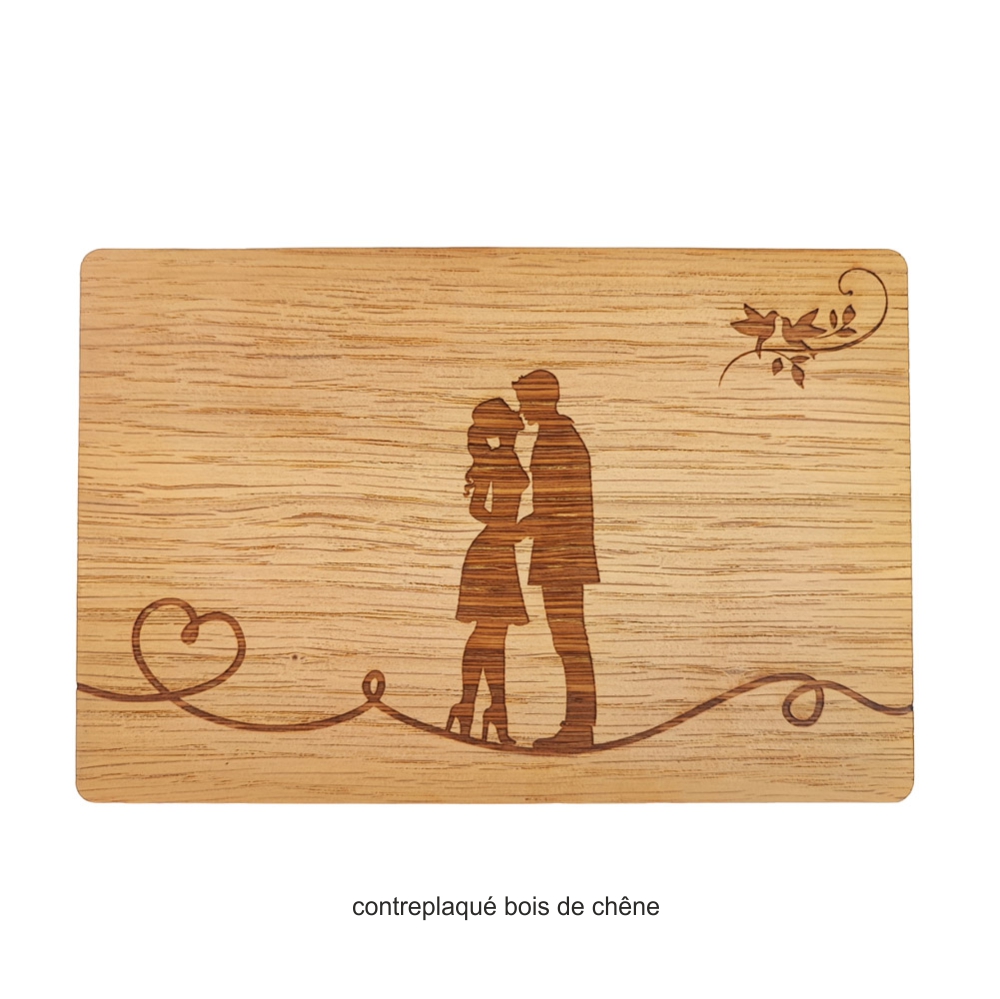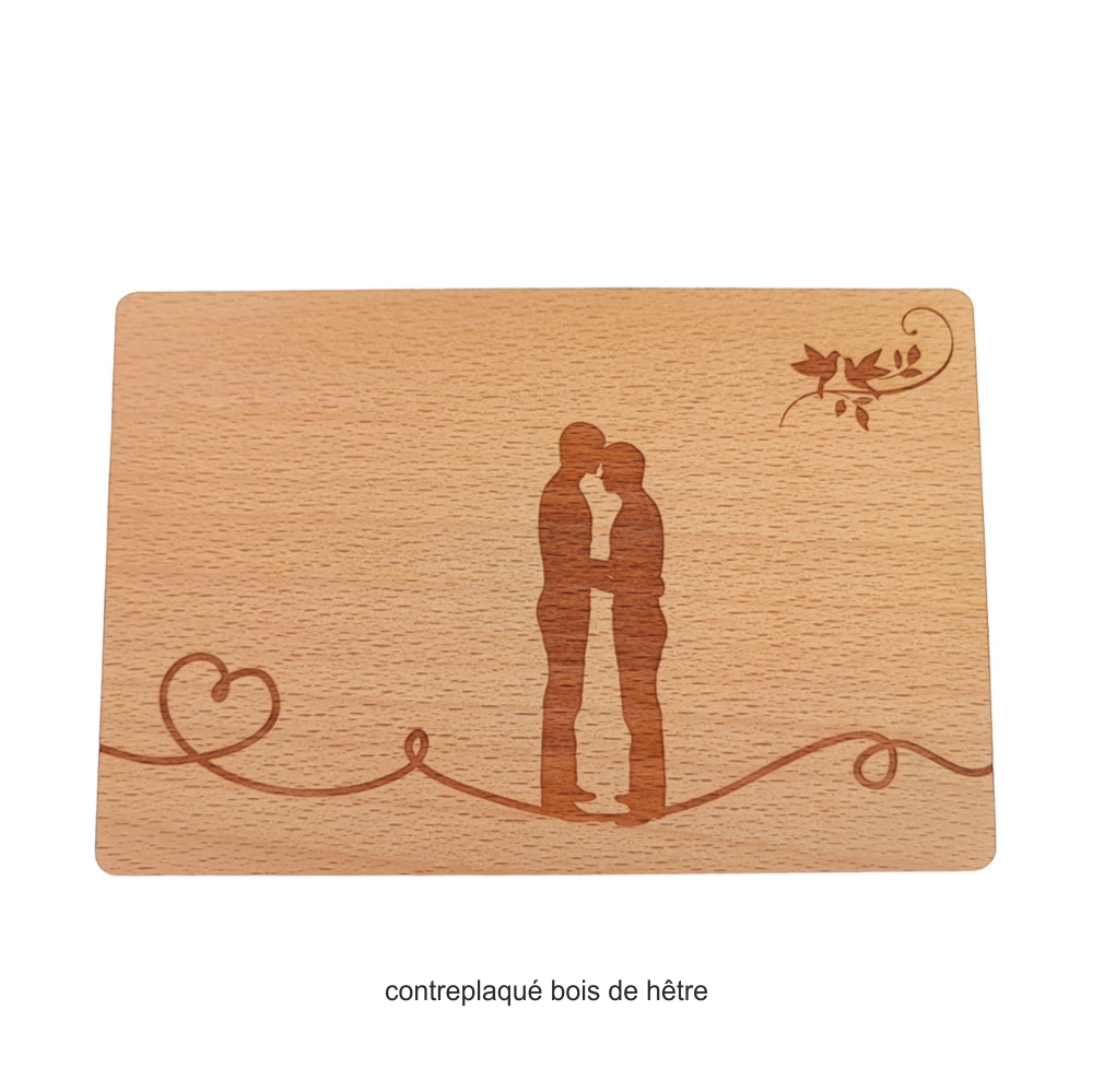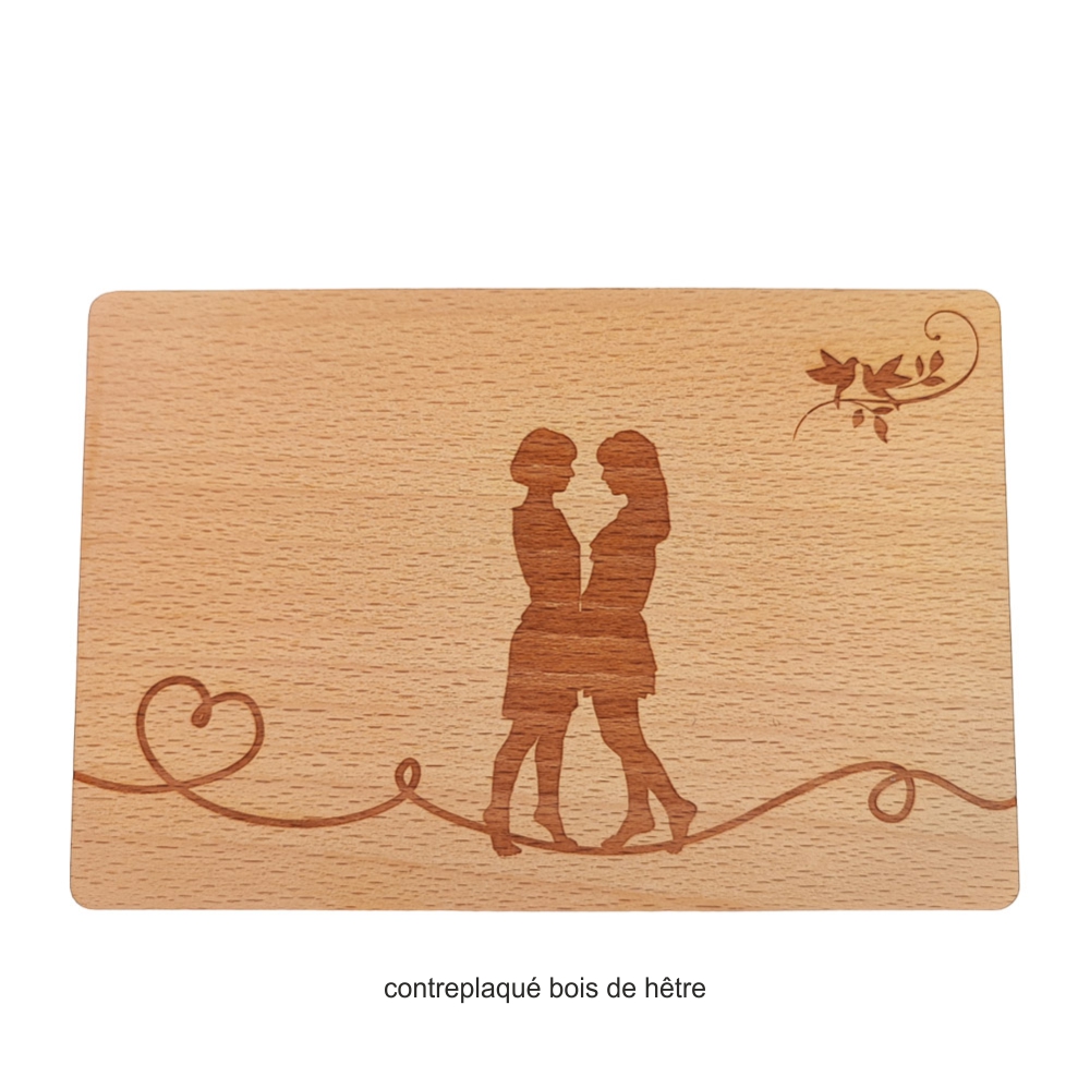 Nos cartes postales personnalisables sont très résistantes et la gravure laser est d’une incroyable finesse et précision. Vous aurez forcément un coup de cœur avec la carte postale bois des Amoureux que vous pourrez personnaliser pour en faire le cadeau unique.