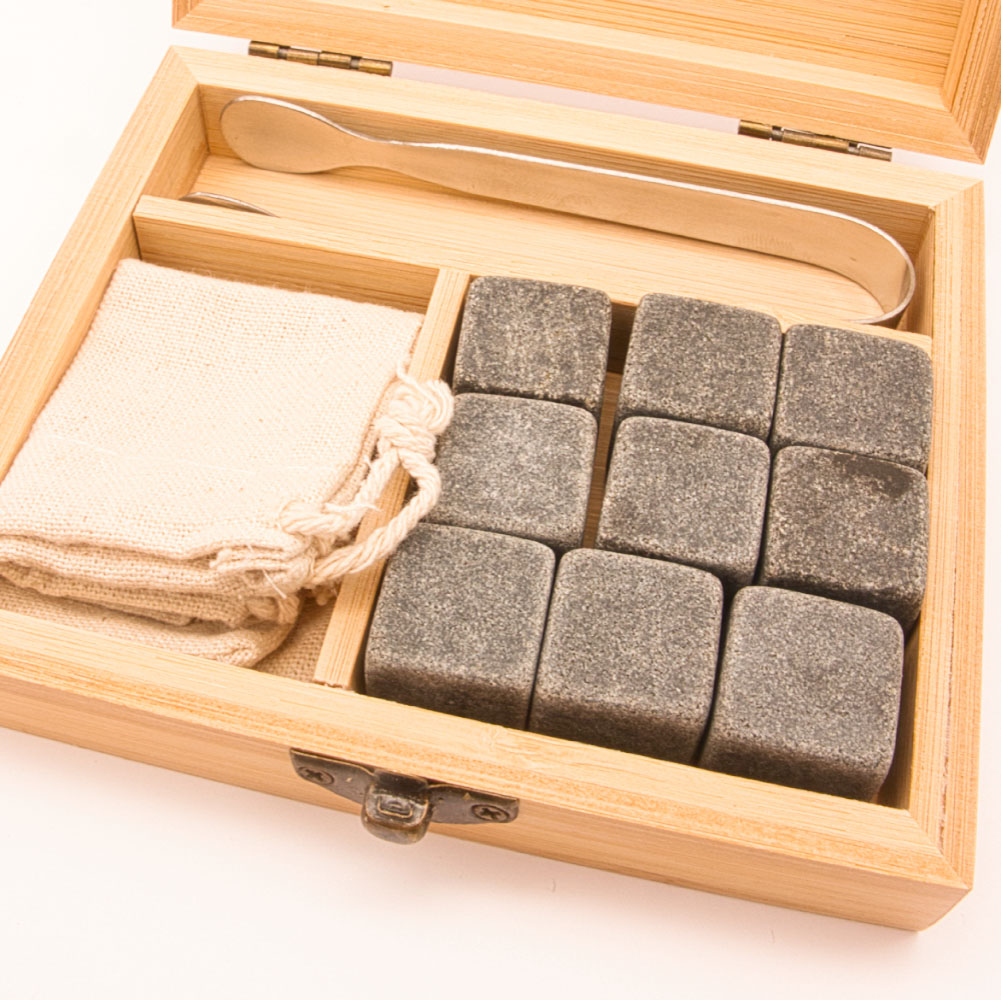 Le coffret comprend 9 pierres à whisky, une pince à glaçon et un sachet en coton qui vous permet d’entreposer vos glaçons au congélateur.