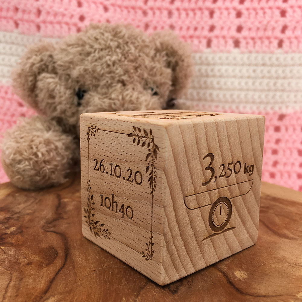 J’ai commandé un cube gravé avec le prénom et infos de naissance de ma fille et je suis SUPER RAVIE, vraiment la gravure est magnifique, les détails floraux, le lettrage, la qualité du bois, les petits icônes pour le poids, la taille etc… rien à dire vraiment. Autant pour soit que pour un cadeau de naissance je recommande a 100% Merci beaucoup