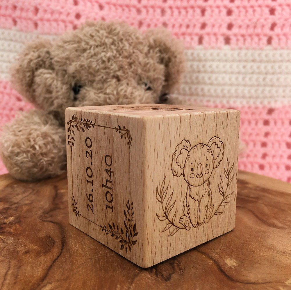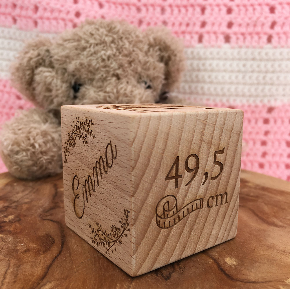 Un magnifique cube pour célébrer la naissance de bébé ! Notre cube de 5 cm de côté est en bois de hêtre naturel, non traité. Il ne manque plus que vos informations pour qu’il devienne vôtre. Remplissez les champs ci-dessous, nous nous occupons du reste ! L’initiale sur le cube sera choisie selon le prénom que vous aurez renseigné.