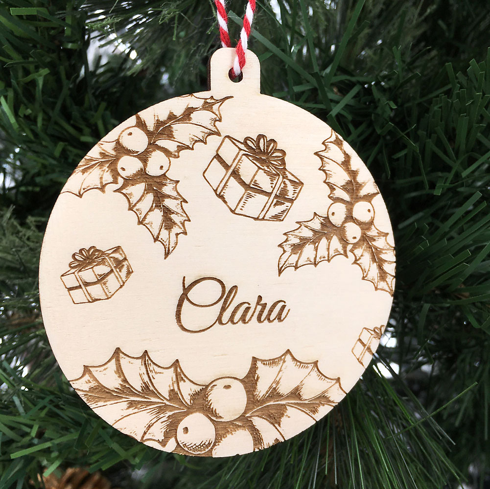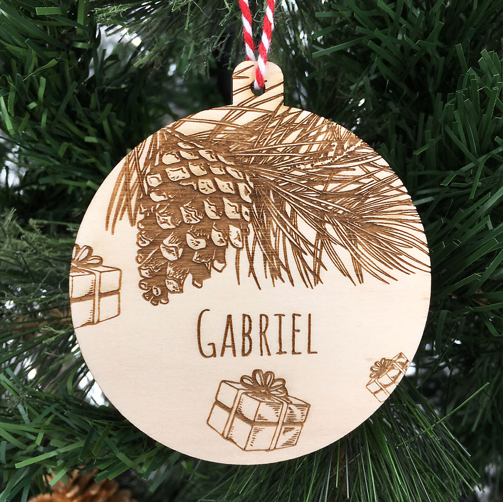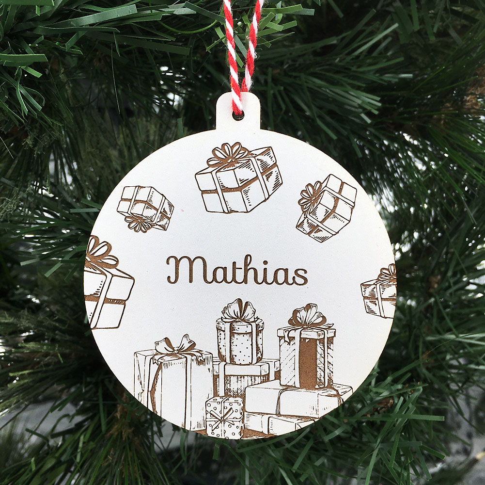Accrochez dans votre sapin la déco de noël Cadeaux personnalisée au prénom de votre enfant ou au vôtre.