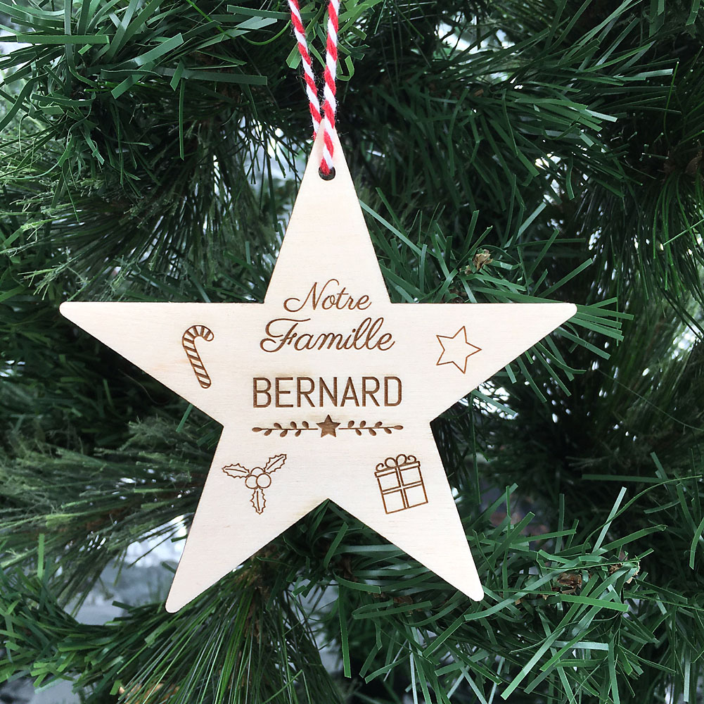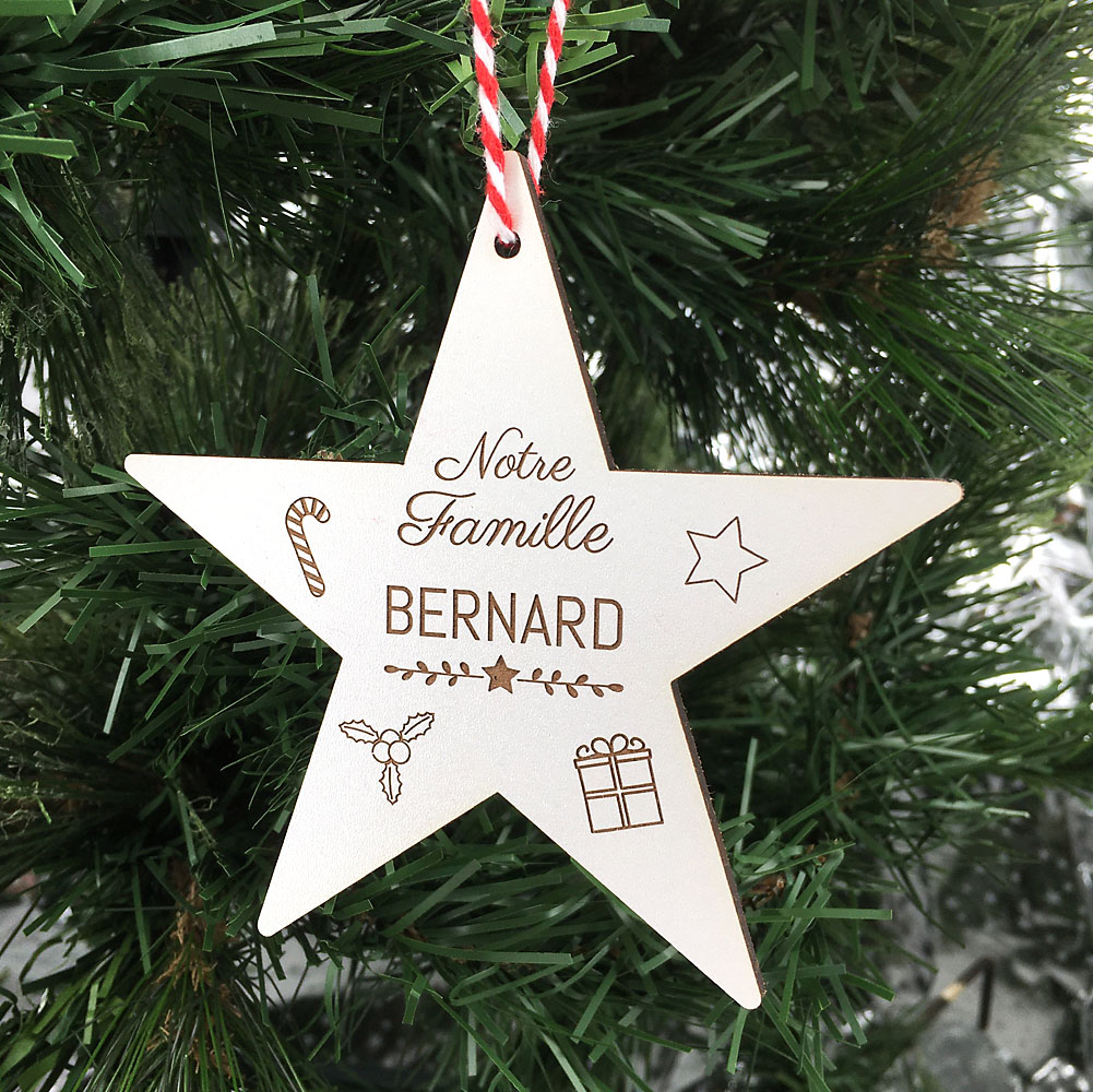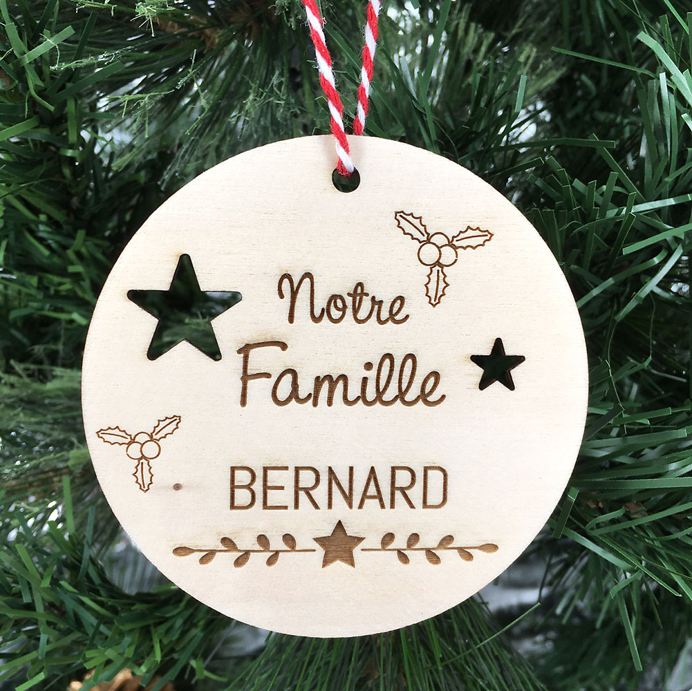 Avec ses formes en étoile ou ronde, notre déco de noël famille aura à coup sûr, une bonne place dans votre sapin. Elle est fournie avec sa ficelle aux couleurs de noël pour l’accrocher dans les branches de votre sapin. Vous avez d’autres modèles disponibles pour décorer votre sapin, découvrez notre décoration personnalisable pour le 1er noël de votre enfant. Egalement pour un premier noël, nous avons la boule La Bannière, sa forme originale et son aspect en fait un produit tout aussi unique.