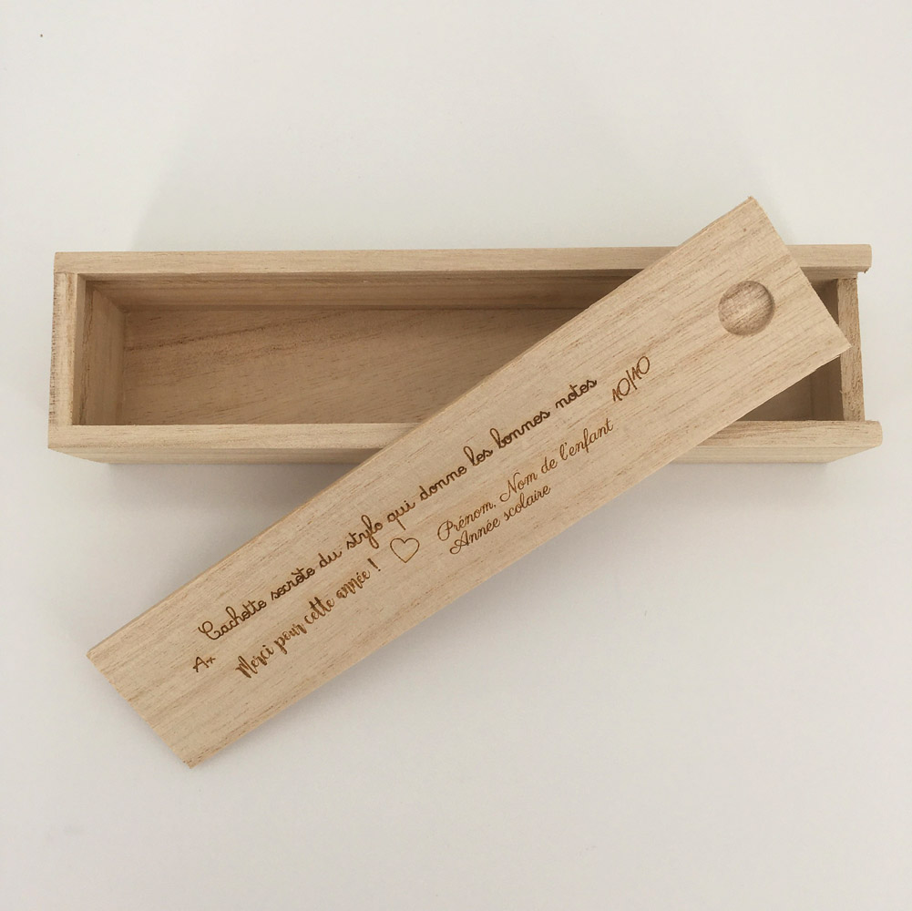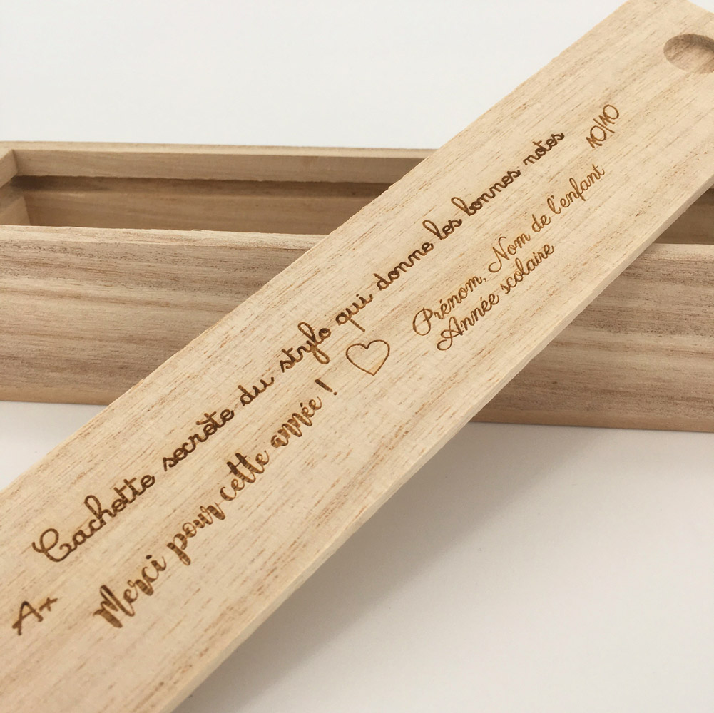 L’école est finie ! Idée cadeau pour les maîtres ou les maîtresses, le plumier bois cachette personnalisable fera un cadeau original, personnalisé et utile à l’instit’ de votre enfant, il ne s’y attend pas. Votre enfant va le surprendre avec ce plumier et son message de remerciement. C’est le cadeau idéal pour la fin de l’année scolaire, ce plumier est un petit objet d’une part, parfait, et d’autre part, pratique, pour un maître ou une maîtresse, il se glisse facilement dans son cartable et aura une belle place sur son bureau. Nous réalisons notre plumier bois personnalisable dans du bois de bouleau en 3 mm d’épaisseur.