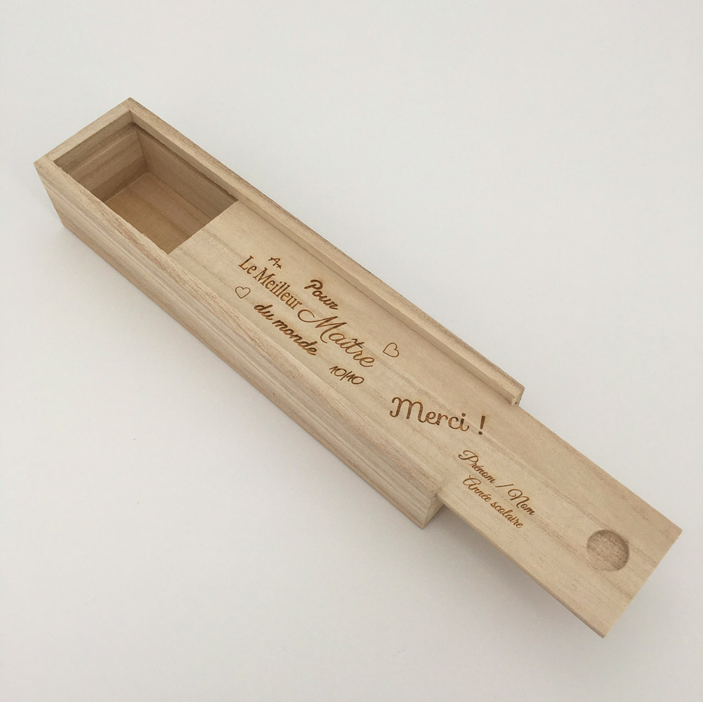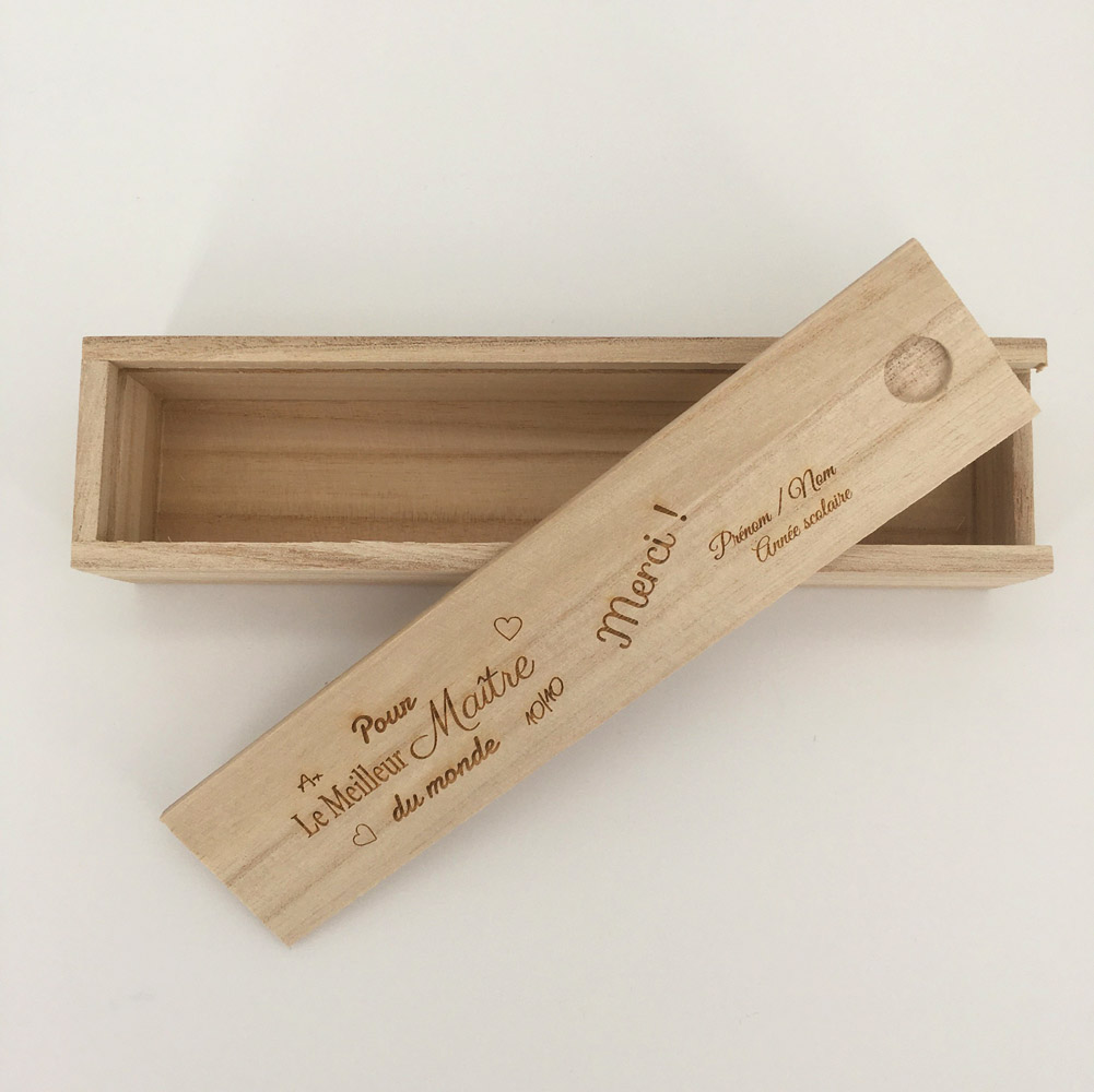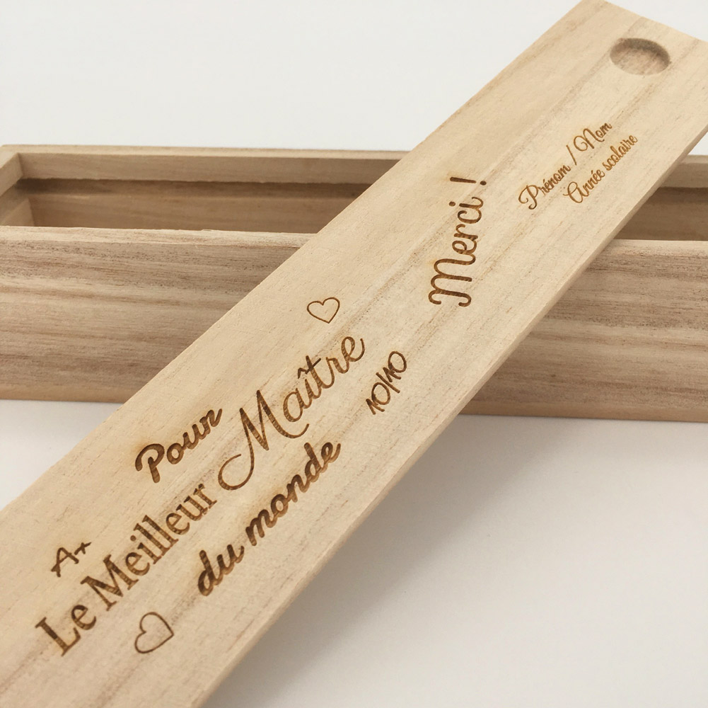 L’école est finie ! Idée cadeau pour les maîtres ou les maîtresses, le plumier bois maître personnalisable fera un cadeau original, personnalisé et utile à l’instit’ de votre enfant, il ne s’y attend pas. Votre enfant va le surprendre avec ce plumier et son message de remerciement. C’est le cadeau idéal pour la fin de l’année scolaire, ce plumier est un petit objet d’une part, parfait, et d’autre part, pratique, pour un maître ou une maîtresse, il se glisse facilement dans son cartable et aura une belle place sur son bureau. Nous réalisons notre plumier bois personnalisable dans du bois de bouleau en 3 mm d’épaisseur.