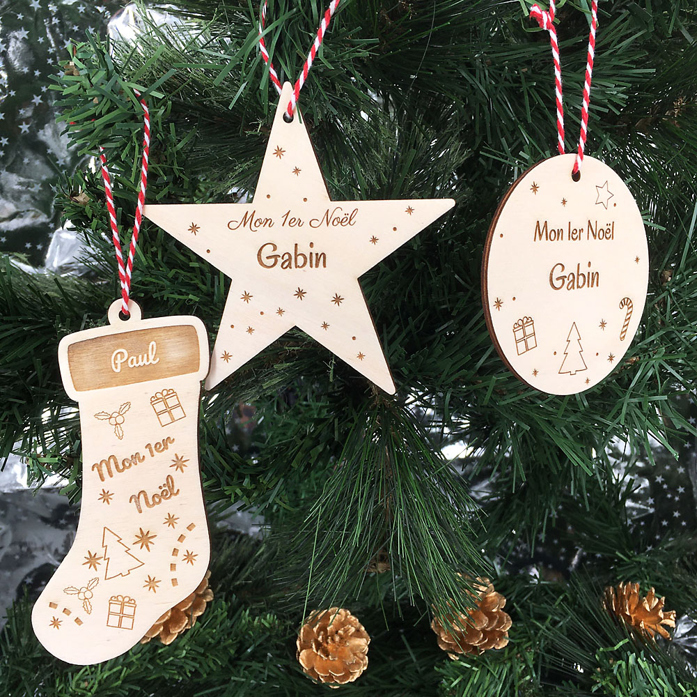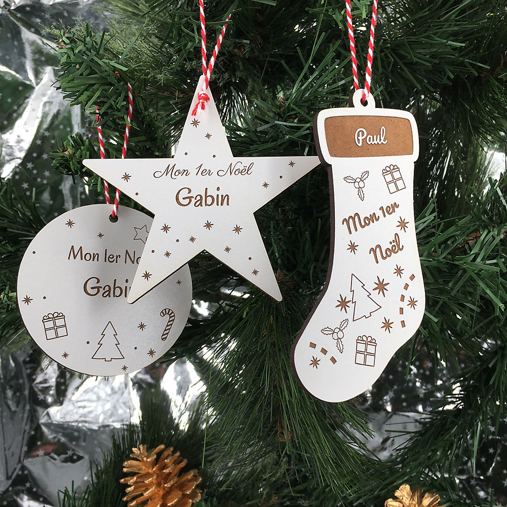 Décorez votre sapin avec notre Lot de 3 – Déco du 1er noël réalisé en bois de peuplier ou de médium blanc de 3mm.
