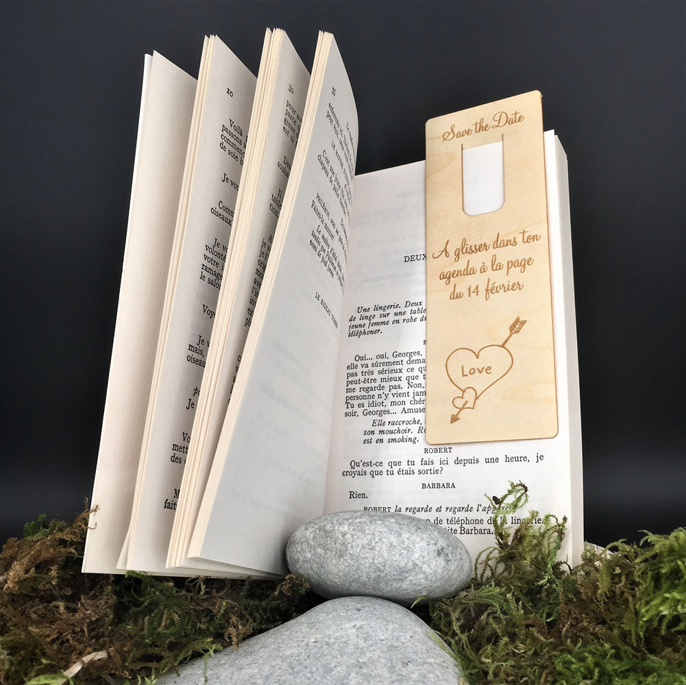 Nous réalisons nos marque-pages bois personnalisés dans du bois de contreplaqué en érable de 1 mm flexible. Nos marque-pages bois personnalisés sont gravés au laser avec une incroyable finesse et précision. Vous aurez forcément un coup de cœur avec le Marque-page Le Saint-Valentin que vous pourrez glisser dans votre livre préféré. N’hésitez pas à fouiller dans la catégorie des marque-pages personnalisés, vous aurez certainement envie d’en refaire un autre avec une personnalisation. Nos marque-pages sont fabriqués en France dans notre atelier en Normandie. Alors, nous vous souhaitons de bonnes lectures, et c’est sûr… vous ne perdrez plus jamais la page !