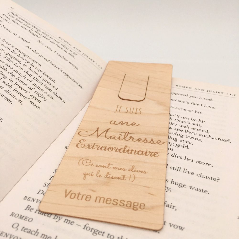 Nous réalisons nos marque-pages bois personnalisés dans du bois de contreplaqué en érable de 1 mm flexible. Nos marque-pages bois personnalisés sont gravés au laser avec une incroyable finesse et précision. Vous aurez forcément un coup de cœur avec le Marque-page Maîtresse extraordinaire que vous pourrez personnaliser pour en faire le cadeau unique. N’hésitez pas à fouiller dans la catégorie des marque-pages personnalisés, vous aurez certainement envie d’en refaire un autre. Nous fabriquons tous nos produits en France dans notre atelier en Normandie. Alors, nous vous souhaitons de bonnes lectures, et c’est sûr… vous ne perdrez plus jamais la page !