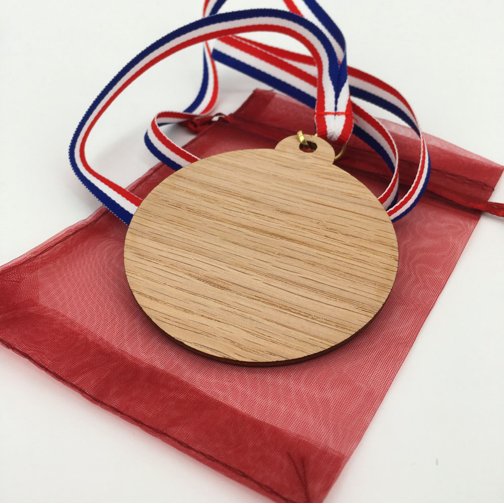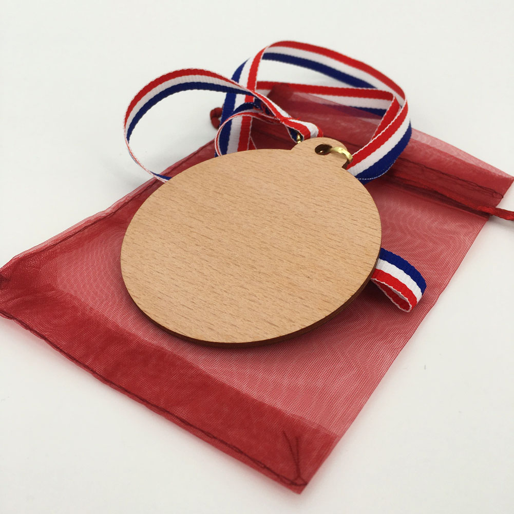 Pour réaliser nos médailles, nous utilisons du bois contreplaqué de chêne ou de hêtre. Nous fournissons avec nos médailles un ruban tour de cou, bleu/blanc/rouge de 40cm de longueur et 1 cm de largeur. Nous fabriquons tous nos produits en France dans notre atelier en Normandie.
