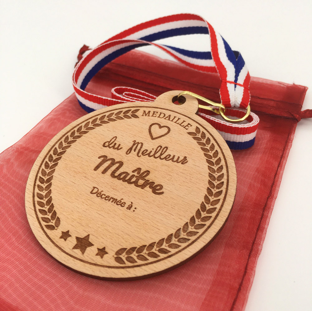 Vous savez bien qui mérite cette médaille bois meilleur maître ? Vous allez pouvoir remercier le maître de votre enfant et lui dire combien il a été important pour lui et pourquoi il mérite cette médaille ! Il n’est pas utile d’organiser une cérémonie officielle à l’école pour lui mettre cette médaille autour du cou, mais, une chose est sûre : cette récompense honorera cet instituteur. Il vous suffit pour cela de renseigner son prénom, son surnom au recto de la médaille bois.