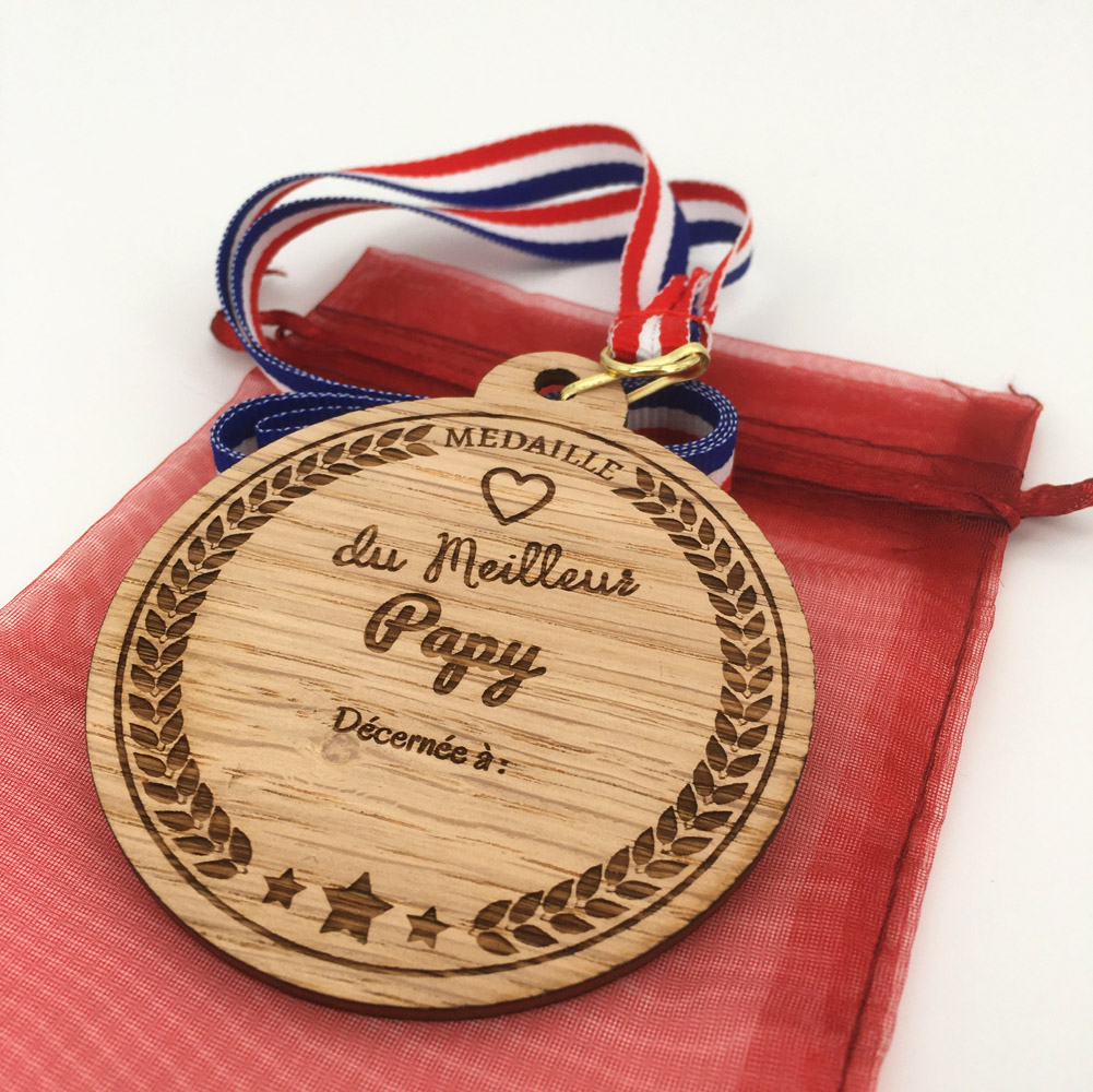 Vous savez bien qui mérite cette médaille bois meilleur papy ?  Vous allez pouvoir lui dire, à votre grand-père, combien il est important pour vous et pourquoi il mérite cette médaille ! Il n’est pas utile d’organiser une cérémonie officielle pour lui mettre cette médaille autour du cou, mais, une chose est sûre : cette récompense honorera votre papy. Il vous suffit pour cela de renseigner son prénom, son surnom au recto de la médaille bois.
