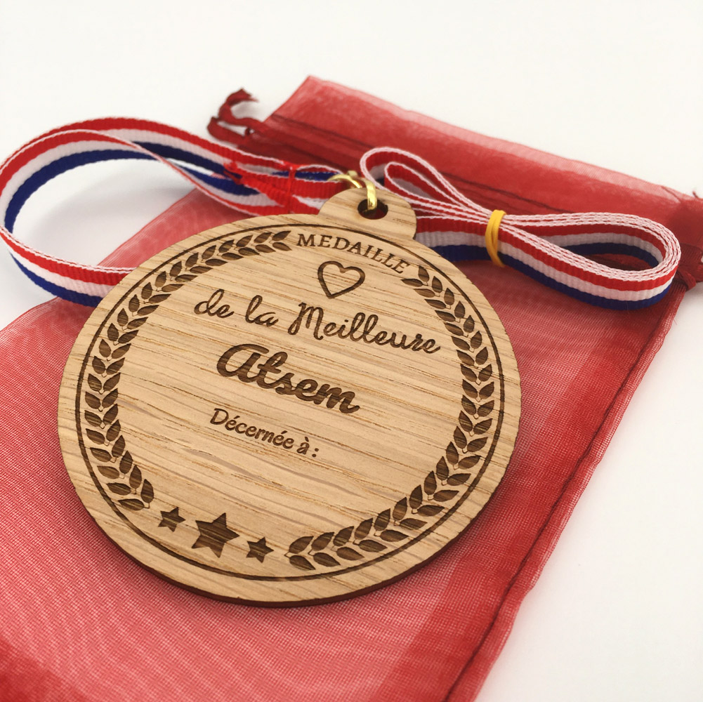 Vous savez bien qui mérite cette médaille bois meilleure atsem ? Vous allez pouvoir remercier l’atsem de votre enfant et lui dire combien elle a été importante pour lui et pourquoi elle mérite cette médaille ! Il n’est pas utile d’organiser une cérémonie officielle à l’école pour lui mettre cette médaille autour du cou, mais, une chose est sûre : cette récompense honorera cette atsem. Il vous suffit pour cela de renseigner son prénom, son surnom au recto de la médaille bois.