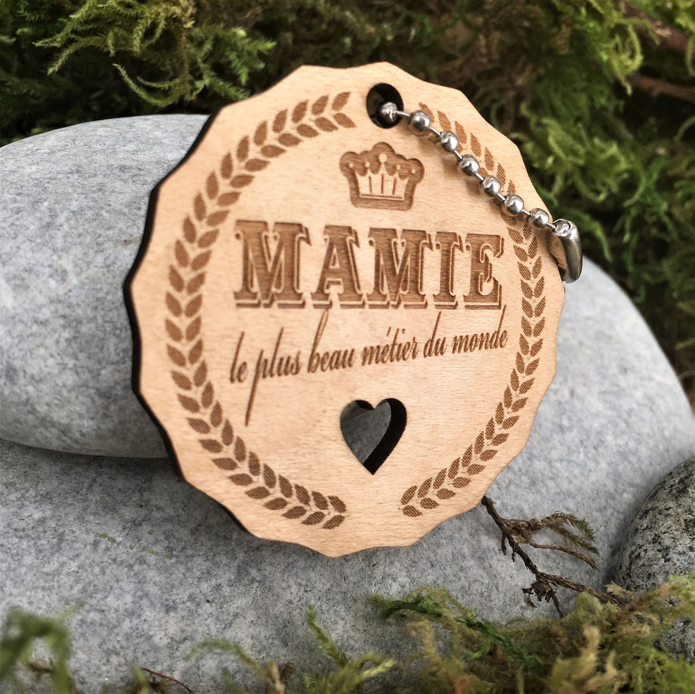 Tous nos porte-clés bois sont personnalisables soit sur une seule face, soit sur les 2 faces. Ajoutez votre texte ou votre prénom ou bien une citation de votre choix. Vous pouvez également personnaliser en ajoutant des cliparts proposés sur beaucoup de nos produits personnalisables. Nous réalisons nos porte-clés personnalisés dans du bois de contreplaqué vernis de 3mm. Nos porte-clés personnalisés sont très résistants et la gravure laser est d’une incroyable finesse et précision. Vous aurez forcément un coup de cœur avec le porte-clés bois le mamie love que vous pourrez personnaliser pour en faire le cadeau unique. Nous fabriquons tous nos produits en France dans notre atelier en Normandie.