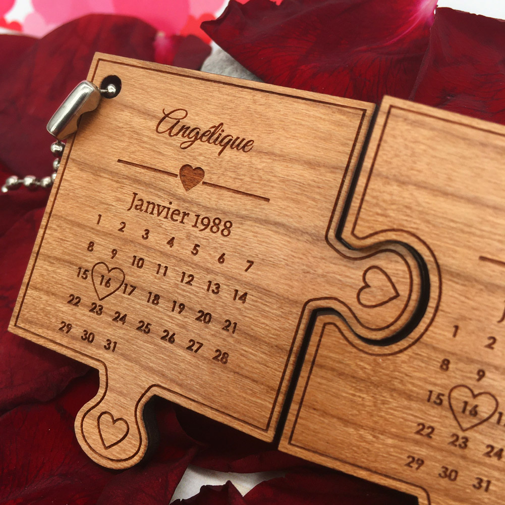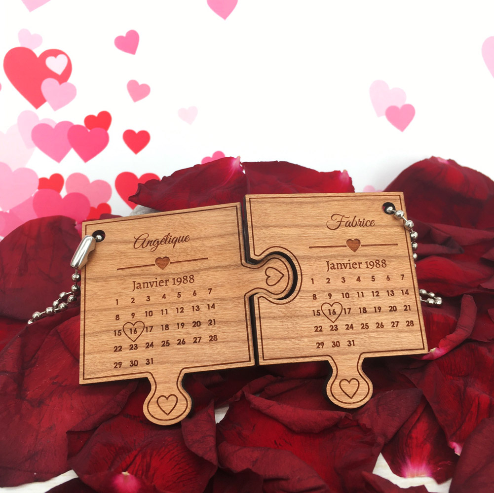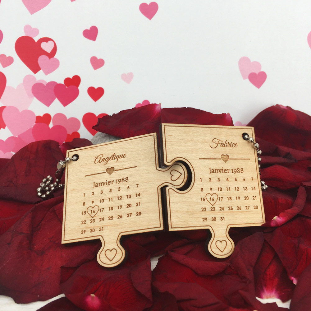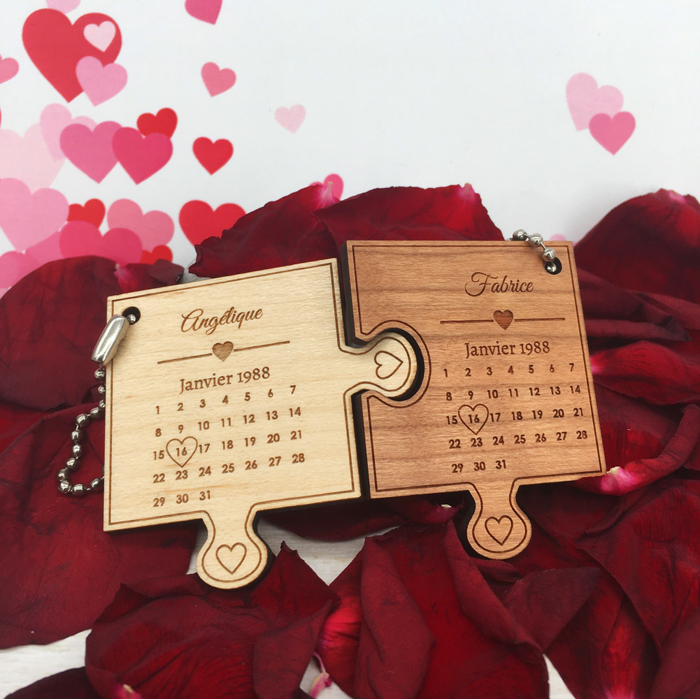 Une idée de cadeau pour la Saint Valentin, pour fêter un anniversaire de rencontre, de mariage… Nous pensons que notre porte-clés le Love puzzle correspondra parfaitement à vos attentes ! Choisissez le(s) bois, sélectionnez ensuite le mois : février ou 30 jours (pour les mois d’avril, juin, septembre et novembre) ou 31 jours (pour les mois de janvier, mars, mai, juillet, août, octobre et décembre) puis personnalisez vos prénoms, le mois et/ou l’année et indiquez-nous dans les blocs textes le jour souhaité (1, 2, 3, 4…) et le motif que vous souhaitez pour entourer ce jour : cœur ou rond, nous nous chargerons de mettre ce motif sur le numéro nous-même. C’est tout simple !