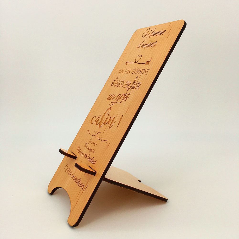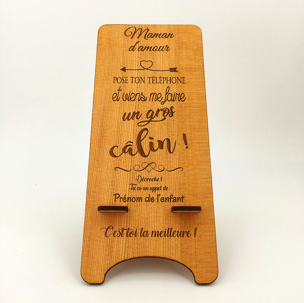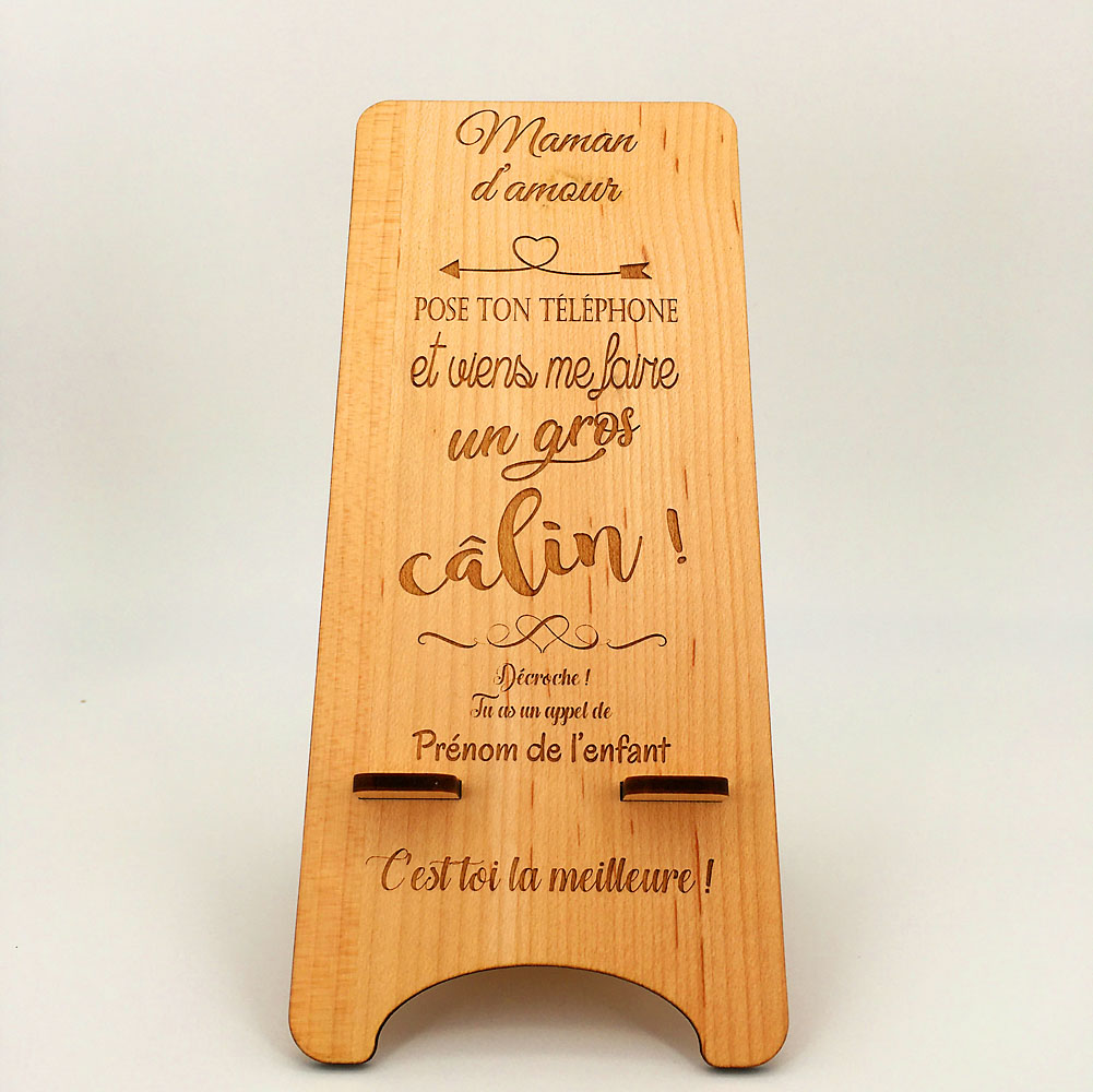 Voici un support de téléphone en bois maman câlin qui a du caractère ! Une belle idée cadeau pour une maman connectée. C’est un accessoire pratique et stable pour poser son téléphone portable, le laisser se reposer en charge ou pour visionner quelques vidéos. Avec son message sans équivoque mais teinté d’une certaine tendresse, le gros câlin ne tardera pas à faire son chemin. Un cadeau idéal pour la fête des mères, un anniversaire, ou pour faire plaisir tout simplement. Le support de téléphone est en bois érable ou cèdre, il est composé de deux parties à assembler par emboîtement avec une personnalisation possible pour y graver le prénom de votre enfant. Un cadeau à petit prix, idéal pour toutes occasions. Notre support convient pour tous types de téléphone portable avec une surface de pose de 8,5 cm de largeur et de 15 cm de hauteur.