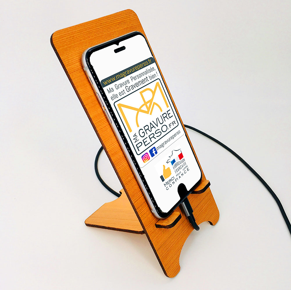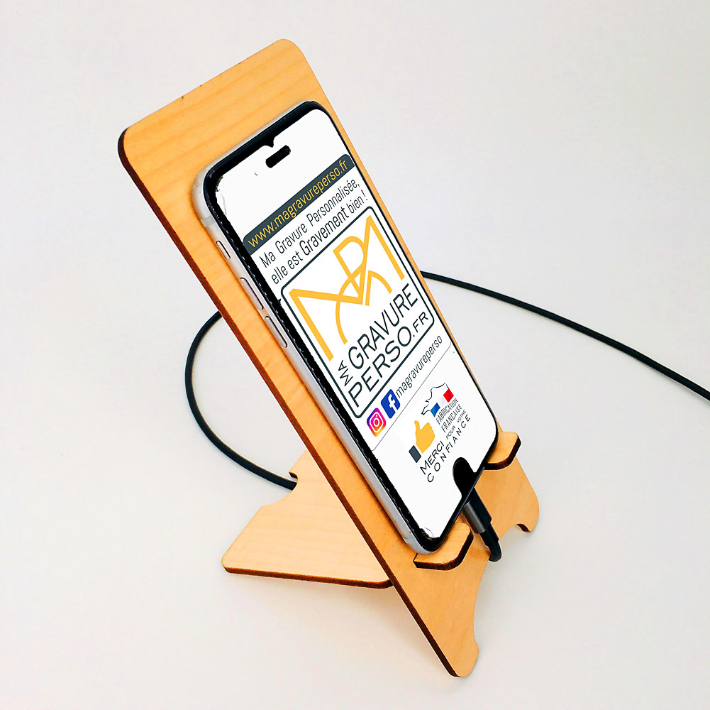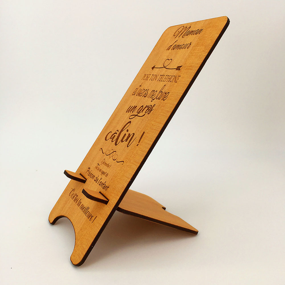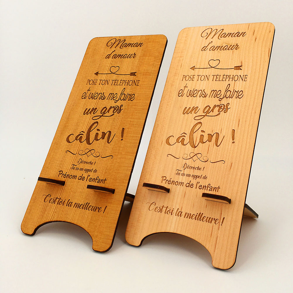 Voici un support de téléphone en bois maman câlin qui a du caractère ! Une belle idée cadeau pour une maman connectée. C’est un accessoire pratique et stable pour poser son téléphone portable, le laisser se reposer en charge ou pour visionner quelques vidéos. Avec son message sans équivoque mais teinté d’une certaine tendresse, le gros câlin ne tardera pas à faire son chemin. Un cadeau idéal pour la fête des mères, un anniversaire, ou pour faire plaisir tout simplement. Le support de téléphone est en bois érable ou cèdre, il est composé de deux parties à assembler par emboîtement avec une personnalisation possible pour y graver le prénom de votre enfant. Un cadeau à petit prix, idéal pour toutes occasions. Notre support convient pour tous types de téléphone portable avec une surface de pose de 8,5 cm de largeur et de 15 cm de hauteur.